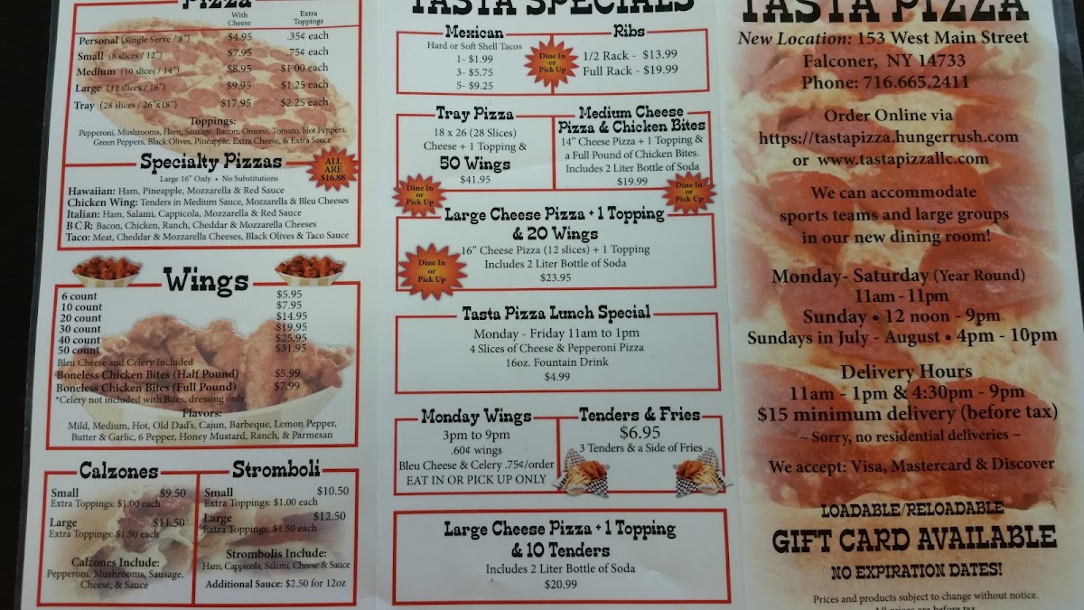 Introducing Tasta Pizza, a delightful gem nestled at 153 W Main St, Falconer, NY. Known for its friendly atmosphere and top-notch service, Tasta Pizza has quickly become a popular haven for pizza lovers and wing aficionados alike.